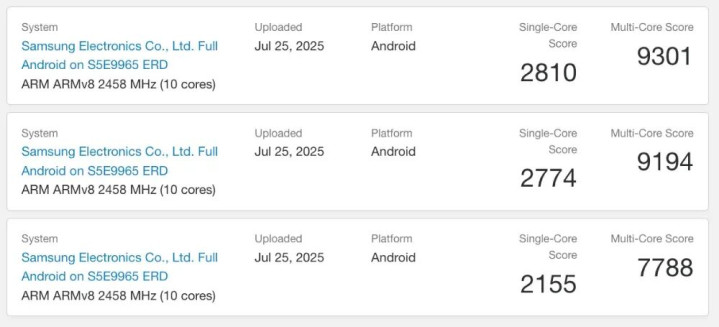 对比来看,前代产品Exynos 2500的单核跑分成绩在2303-2356之间,多核跑分成绩在8062-8076之间。
