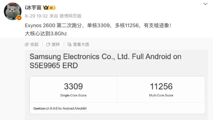 同时,博主@i冰宇宙 此前的一份爆料曾提到过:“Exynos 2600 第二次跑分,单核3309,多核11256,有支棱迹象!大核心达到3.8Ghz”。