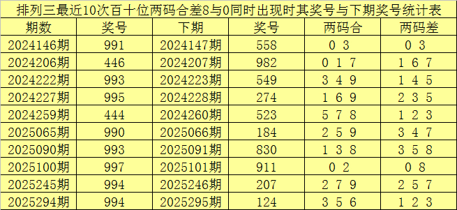 百十位合差分析:上期奖号百十位开出44组合,两码合为8,两码差为0,最近10次百十位两码合8与两码差0同时出现时,其奖号和下期奖号分别为:
