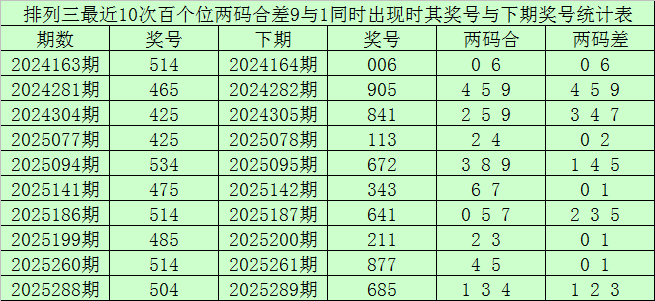 从以上统计可以看出,百个位两码合差9与1同时出现之后其下期两码合差表现最热的4个分别为:0145,本期百个位两码合差可以参考这四码中的数据。