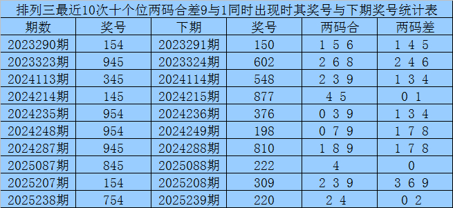 十个位合差分析:上期奖号十个位开出45组合,两码合为9,两码差为1,最近10次十个位两码合9与两码差1同时出现时,其奖号和下期奖号分别为: