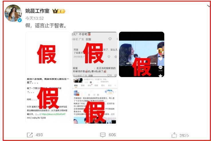 3月18日,姚晨工作室晒出报道姚晨和侯雯元绯闻的爆料帖、文章和视频截图,直言“假,谣言止于智者”。